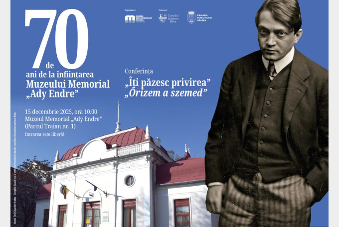 Cu prilejul aniversării a 70 de ani de la înființarea Muzeului Memorial „Ady Endre” din Oradea, luni, 15 decembrie, se va desfășura conferința „Îți păzesc privirea” / „Őrizem a szemed”. Evenimentul va avea loc începând cu ora 10.00, în incinta muzeului din Parcul Traian nr. 1.