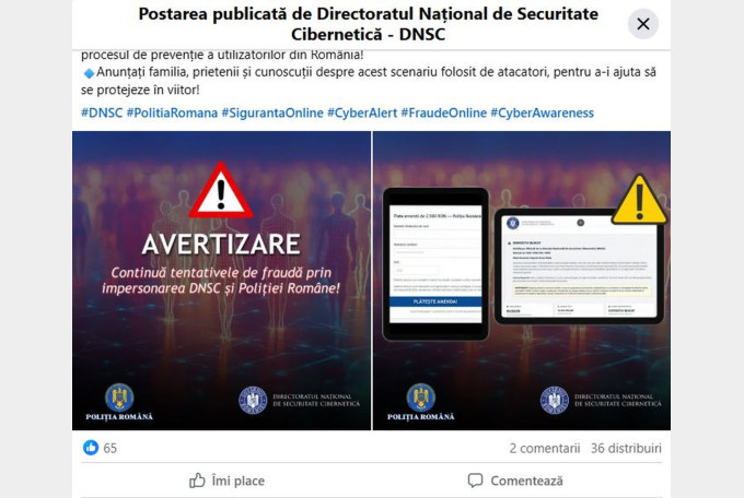 Un nou tip de înșelătorie online cu mesaje false care pretind că Poliția Română și Directoratul Național de Securitate Cibernetică (DNSC) au blocat dispozitivele utilizatorilor și impun plata urgentă a unei amenzi de 1.250 lei s-a răspândit în România, informează autoritățile. Aceste mesaje amenință cu pedepse dure și folosesc metode de intimidare pentru a obține date și bani ilegal.