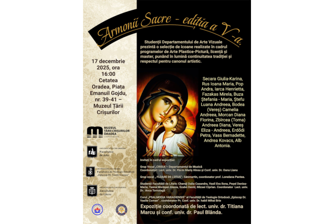 Expoziția Armonii Sacre, organizată de Facultatea de Arte a Universității Oradea, reunește lucrări realizate de studenți care evocă frumusețea artei bisericești și pictura icoanelor pe lemn și sticlă. Evenimentul găzduit de Muzeul Orașului Oradea – Cetatea Oradea reflectă tradiția și valoarea icoanei ca formă de artă sacră, potrivit coordonatoarei lect. univ. dr. Titiana Alina Marcu.