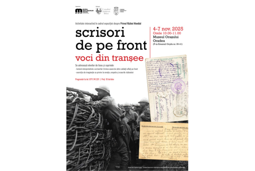 În perioada 4-7 noiembrie, la Muzeul Orașului Oradea va avea loc atelierul „Scrisori de pe front. Voci din tranșee”, dedicat elevilor de liceu. Acesta începe zilnic la ora 10.00 și propune o lectură interpretativă a corespondenței soldaților trimiși acasă în timpul războiului.