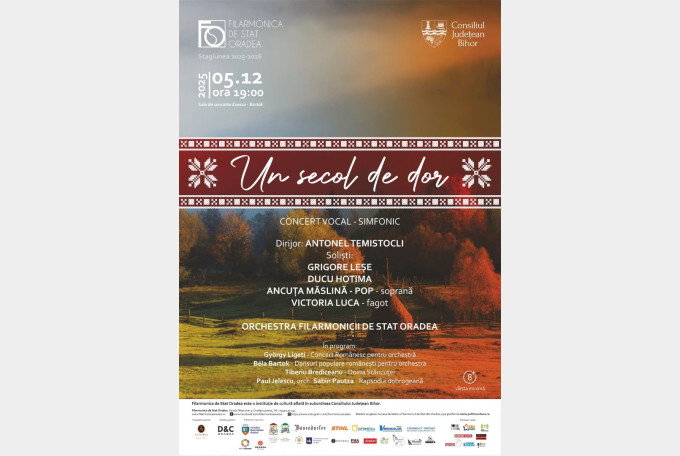 Filarmonica de Stat Oradea organizează vineri, 5 decembrie, un concert vocal-simfonic special în Sala de concerte „Enescu-Bartók”. Evenimentul va începe la ora 19:00 și se intitulează „Un secol de dor”.