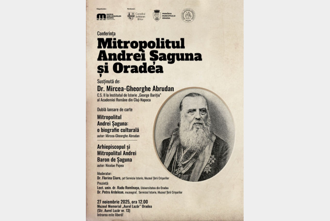 Joi, 27 noiembrie, de la ora 12.00, Muzeul Memorial „Aurel Lazăr” din Oradea găzduiește conferința „Mitropolitul Andrei Șaguna și Oradea”, susținută de dr. Mircea-Gheorghe Abrudan, istoric la Institutul de Istorie „George Barițiu” al Academiei Române din Cluj-Napoca.