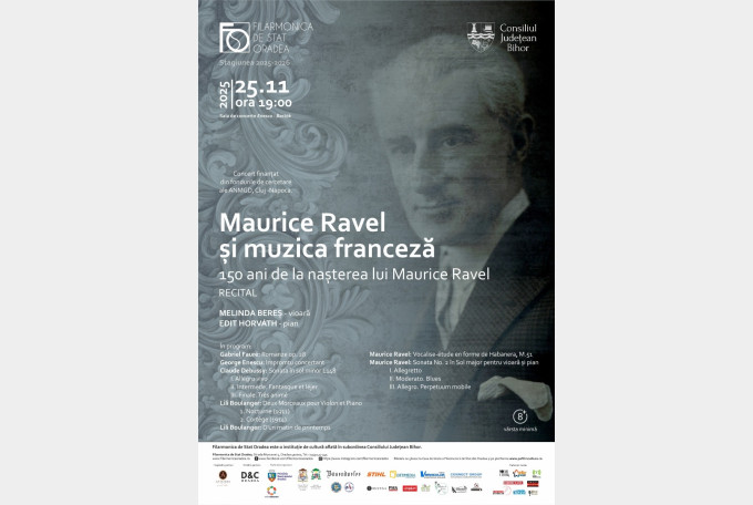 Astăzi, 25 noiembrie, la ora 19:00, Filarmonica de Stat Oradea organizează un recital dedicat lui Maurice Ravel, cu ocazia împlinirii a 150 de ani de la nașterea compozitorului. Evenimentul are loc în sala Enescu–Bartók și aduce în prim-plan muzica impresionistă franceză.