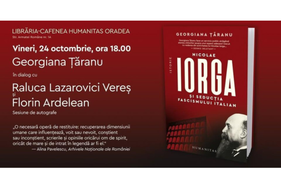 Vineri, 24 octombrie, de la ora 18.00, publicul orădean este invitat la lansarea cărții „Nicolae Iorga și seducția fascismului italian”, scrisă de istoricul Georgiana Țăranu, profesor la Universitatea „Ovidius” din Constanța. Volumul este rezultatul a zece ani de cercetări aprofundate realizate în arhive românești, italiene și vaticane.