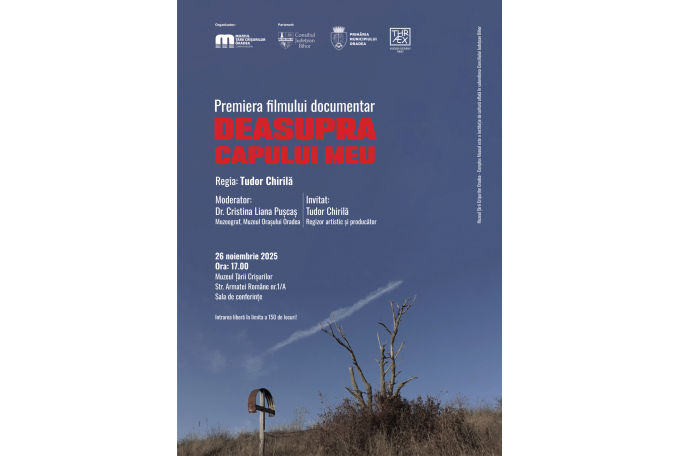 Miercuri, 26 noiembrie, la ora 17.00, în Sala de conferințe a Muzeului Țării Crișurilor va avea loc premiera filmului documentar „Deasupra capului meu”, semnat de regizorul și producătorul Tudor Chirilă. Evenimentul va fi moderat de dr. Cristina Liana Pușcaș, muzeograf la Muzeul Orașului Oradea.