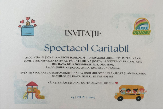 Vineri, 14 noiembrie, Colegiul Național „Mihai Eminescu” din Oradea va fi gazda unui spectacol caritabil organizat de Asociația Națională a Profesorilor Psihopedagogi „Orizont” împreună cu Comitetul Reprezentativ al Părinților. Evenimentul reunește artiști, profesori, părinți și voluntari într-o luptă pentru o cauză nobilă.